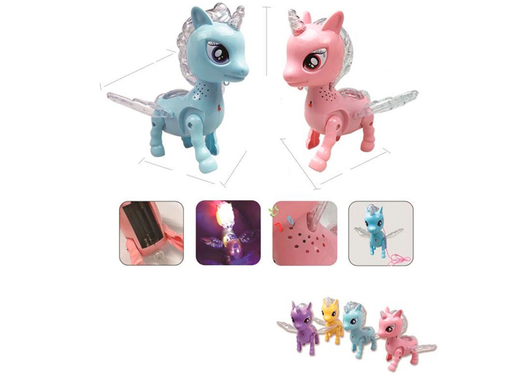Описание:Музыкальная игрушка 1481 единорог/пегас, муз,свет, ходит, 4цв, на бат-ке, в кульке, 17-19-6см
