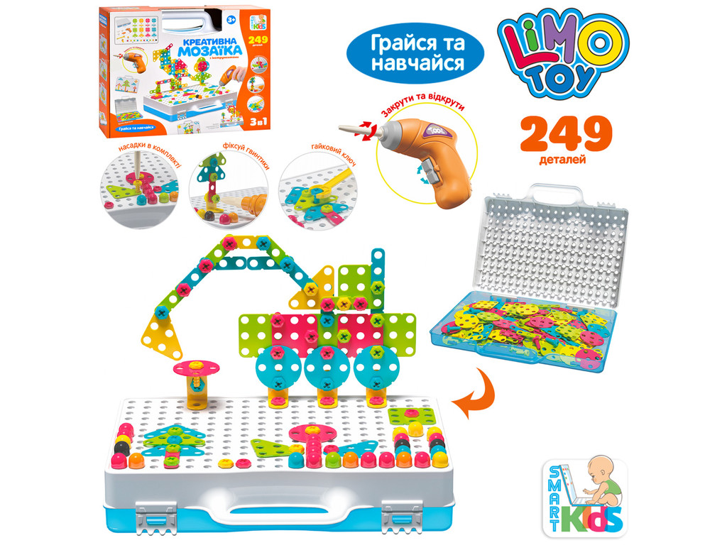 Описание:Мозаика M 5590 3в1, на шурупах,шуруповерт, 249дет,на бат-ке,чемодан,в кор-ке,31-24,5-6,5см