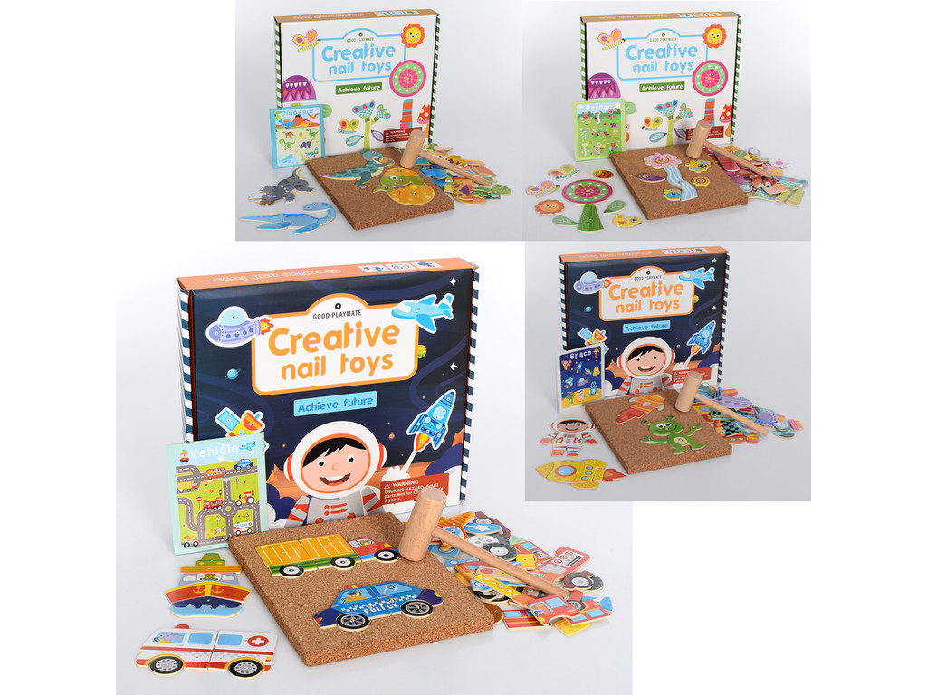 Описание:Деревянная игрушка Пазлы MD 1611 досточка,молоток,гвозди, 4вида,в кор-ке,27,5-24-4см
